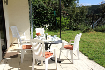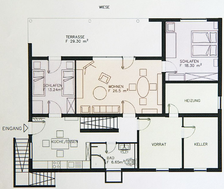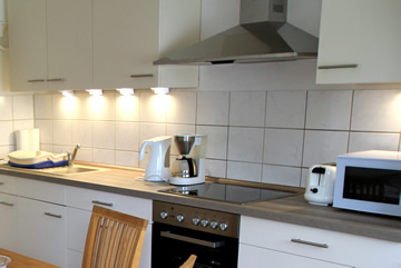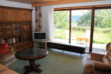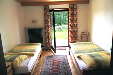 Die Untergeschoss Ferienwohnung (81 qm) bietet Platz für 2 - 5 Personen und verfügt über zwei Schlafzimmer mit Doppelbetten (Zustellmöglichkeit eines weiteren Bettes), ein großes Wohnzimmer mit Fernseher, Küche, Bad mit Du/WC und einer großen Terrasse mit Garten zum Entspannen. Die Küche mit gemütlichen Essplatz ist mit Cerankochplatte, Backofen, Mikrowelle, Spüle sowie Kühlschrank mit Tiefkühlfach und einem Radio ausgestattet. Handtücher sind im Preis enthalten.